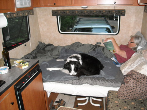 We're at a water/electric site in William Tugman State Park on the Oregon Coast. Beautiful park on Eel Lake. Campground was totally full in the best summertime gypsy camp sort of way. Tons of families, all kinds of recreational gear and vehicles, wonderful campfire and cooking smells, really helpful people who came over to offer pointers to the rookie trailer couple. We ran the 14RB through every system except the shower, used the microwave and AC, ran the Norcold on AC and gas (it froze stuff on the 5 setting), cooked spaghetti, washed dishes, made great coffee in the Goodwill Bodum, dumped the tanks successfully for the very first time. All in all, a tremendous amount of fun with everything performing perfectly. Even Ned the Mutant Border Collie loved it.
